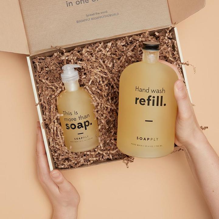 We're tackling the plastic problem from your sink. Soapply is bottled in recycled glass that can be reused and refilled.